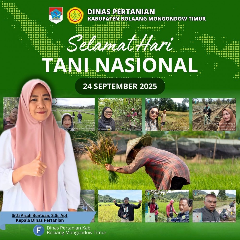 Hari ini, 24 September 2025, kita memperingati *Hari Tani Nasional*. Momentum ini menjadi pengingat bagi kita semua, betapa pentingnya peran petani sebagai garda terdepan dalam menjaga ketahanan pangan bangsa. Dinas Pertanian Kabupaten Bolaang Mongondow Timur terus berkomitmen untuk mendampingi, melayani, serta memberdayakan petani melalui berbagai program dan kegiatan, di antaranya :